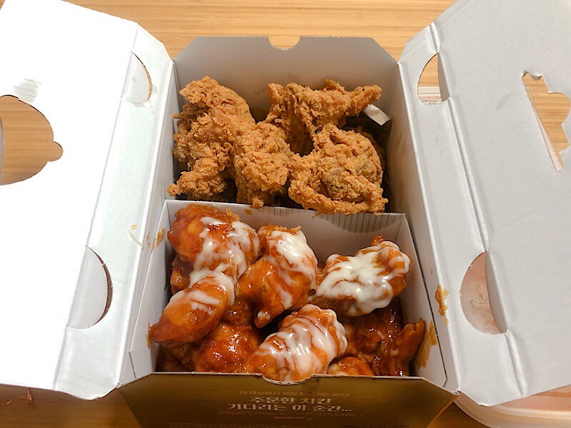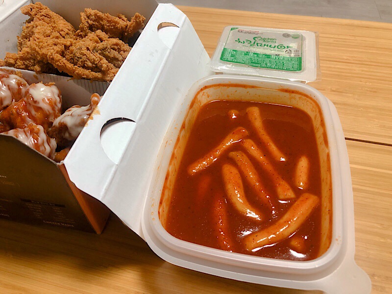 1탄과 다른 점은 아무래도 치킨 한 마리에서 반마리씩 두 개로 나누다 보니 떡볶이 양이 줄어든 게 아닌가 싶어요.
