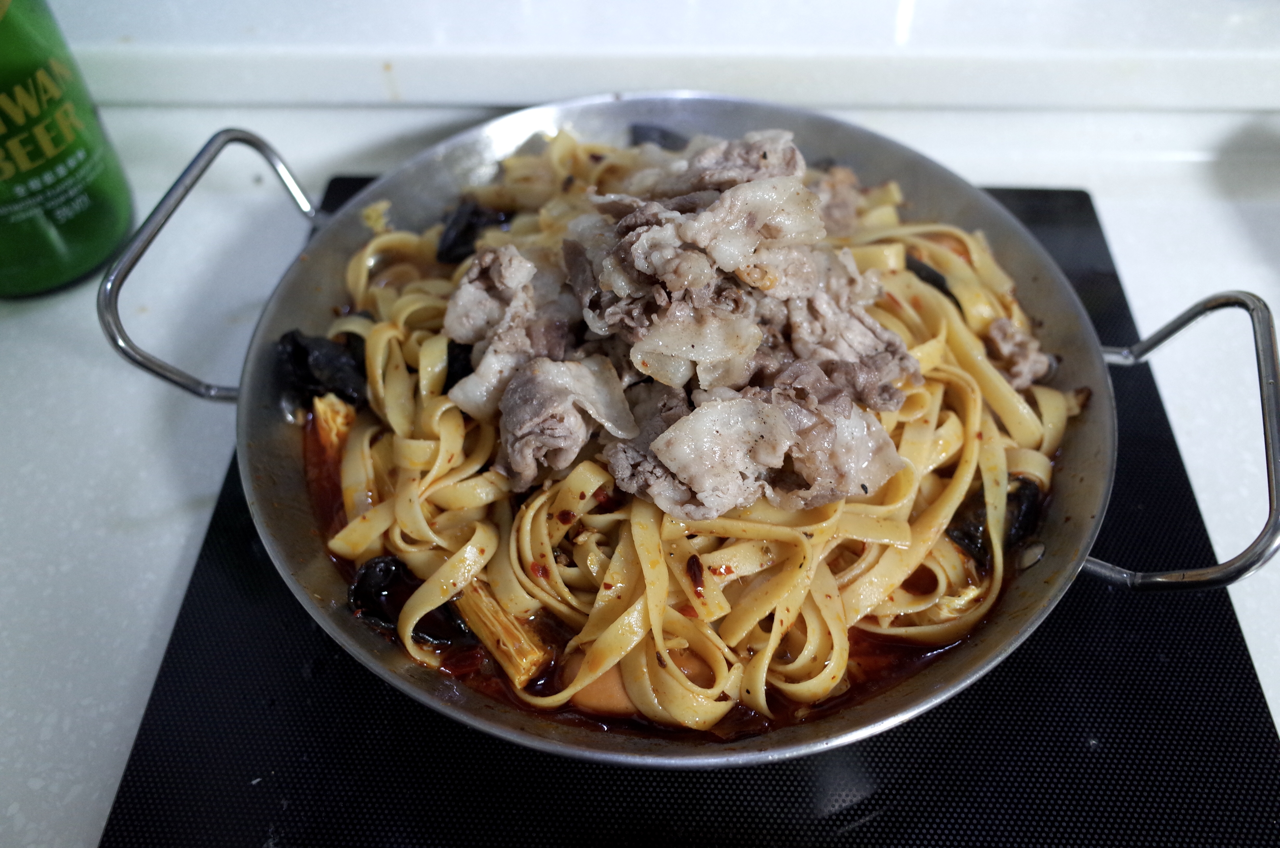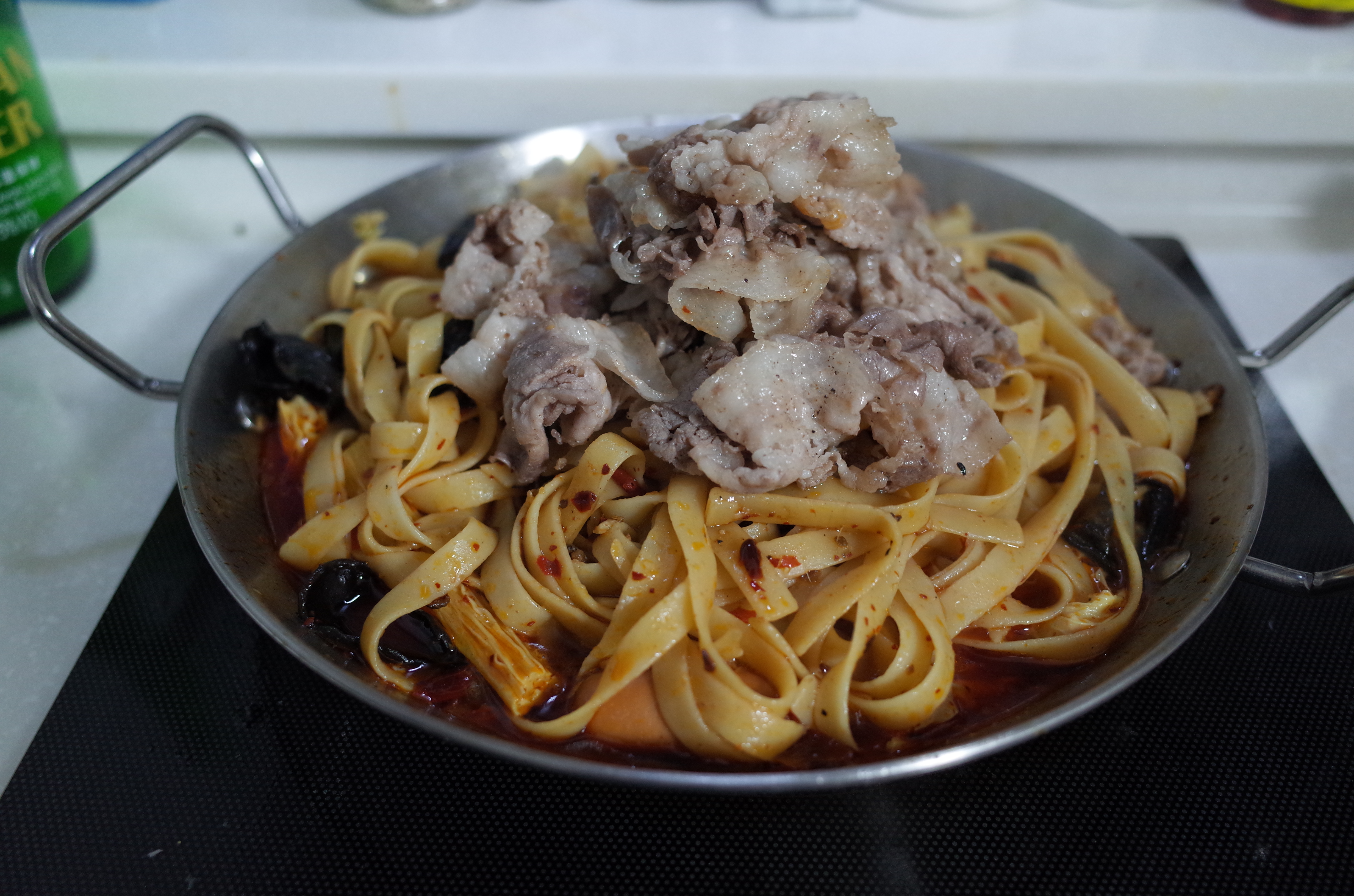 재료 : 파스타면, 다진 마늘, 마라 소스, 푸주(건두부), 햄, 대패삼겹살