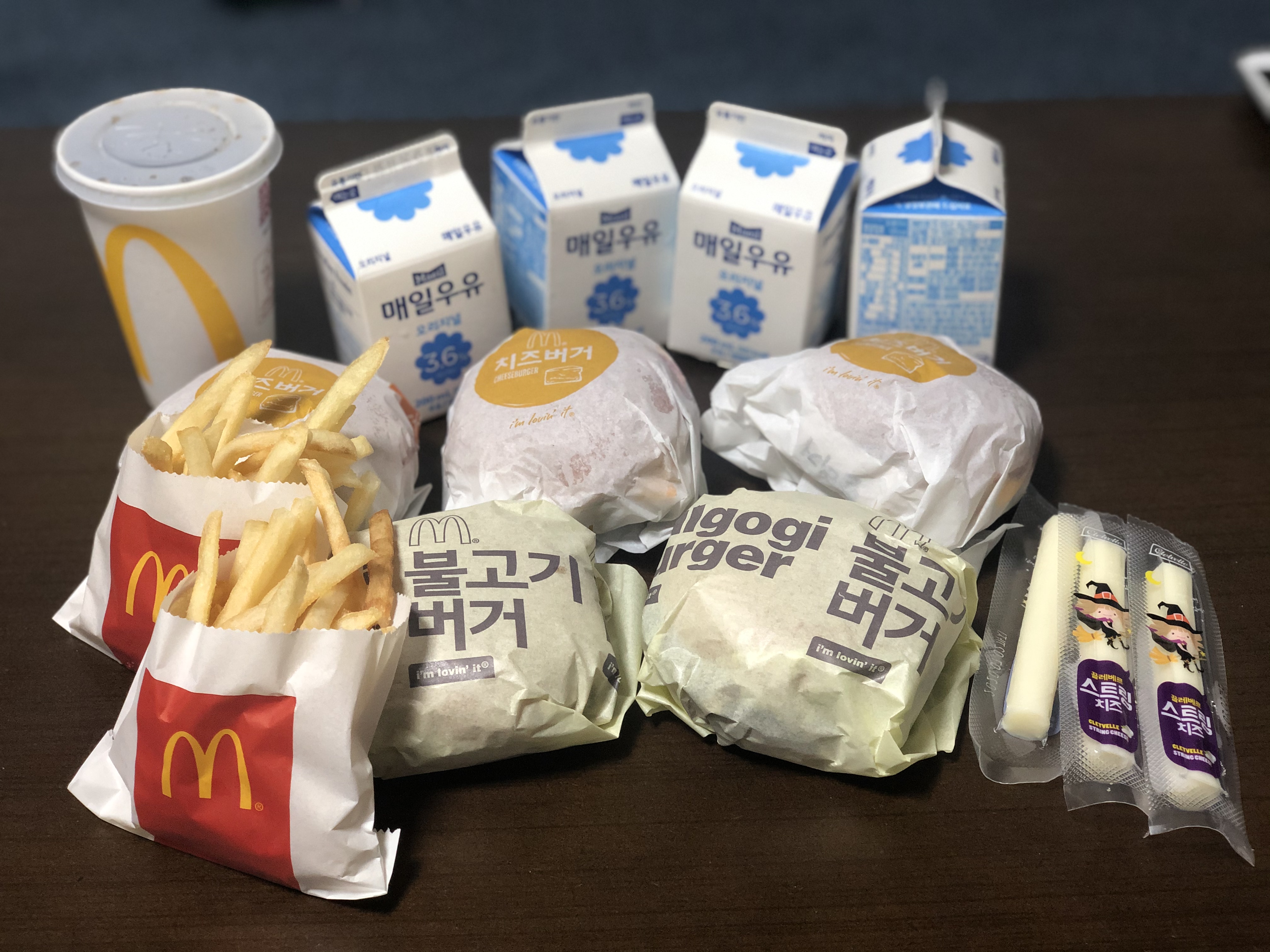 저희는 치즈버거 3개, 불고기버거 2개, 감자튀김 2개, 스트링치즈 3개, 콜라 1개, 우유 4개 주문했답니다.