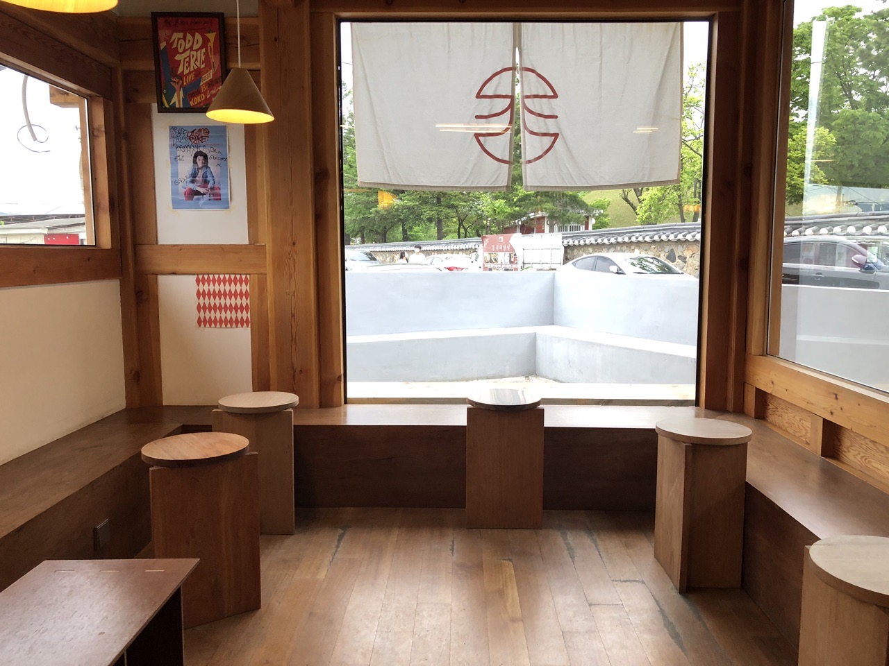 내부는 생각보다 협소하네요. 디귿자 형태로 붙박이 의자가 있고 원형 테이블이 있어요.