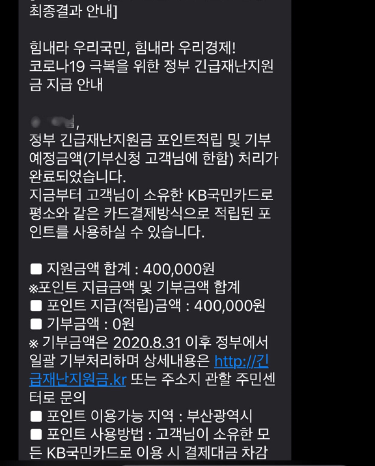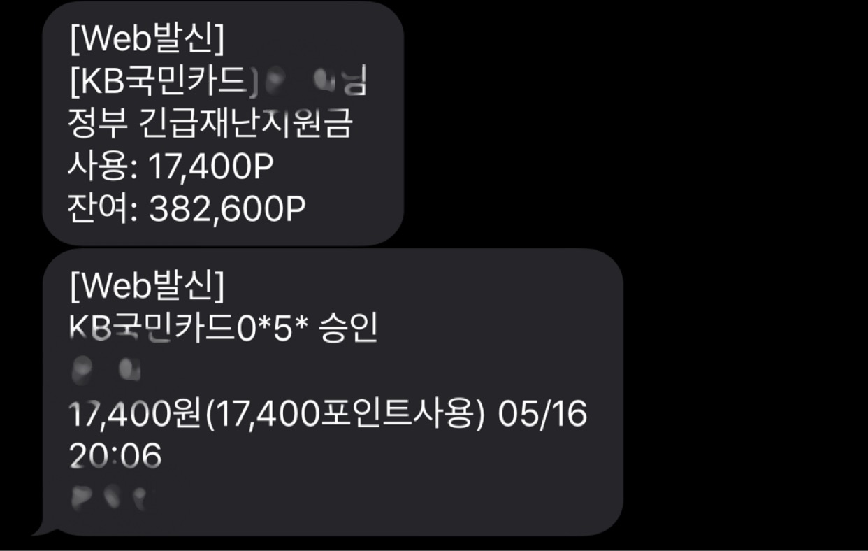 롯데/하나/KB국민/ 재난지원금 사용시 문자메시지를 통해 실시간으로 사용금액, 잔액 안내.