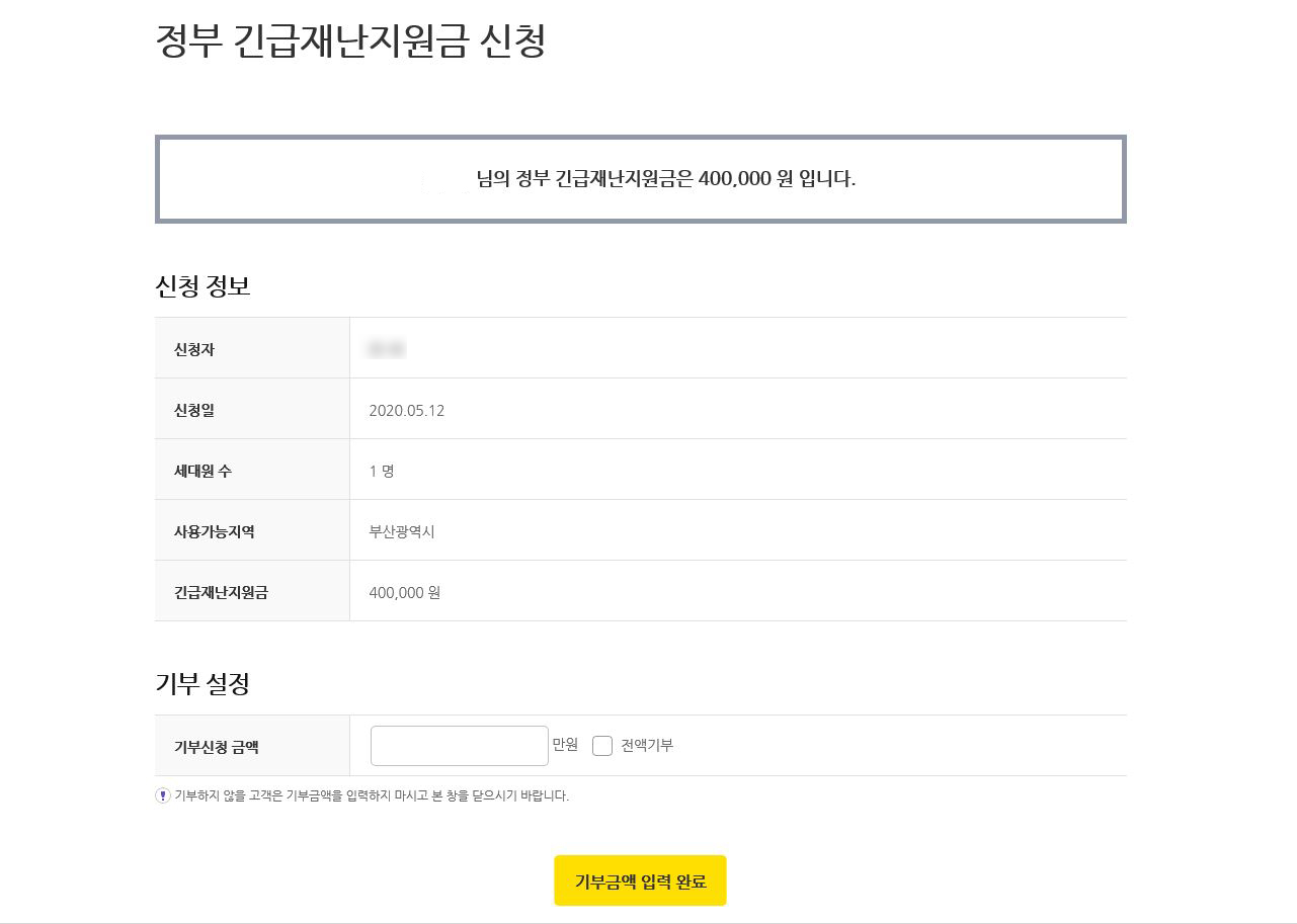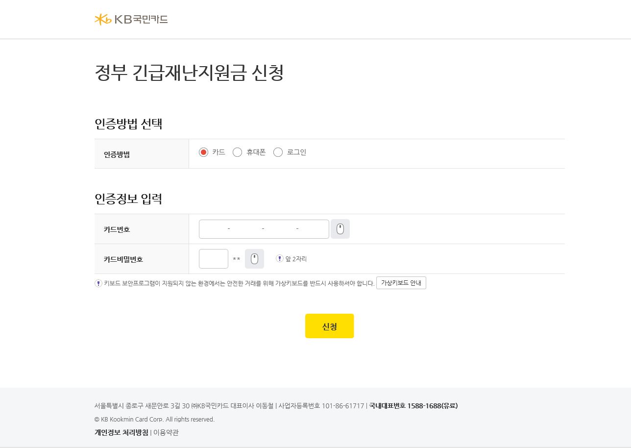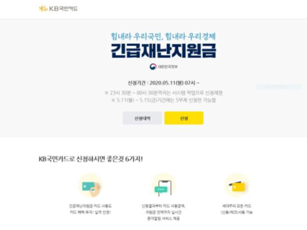 정부 재난지원금 국민카드 신청 완료되었습니다.