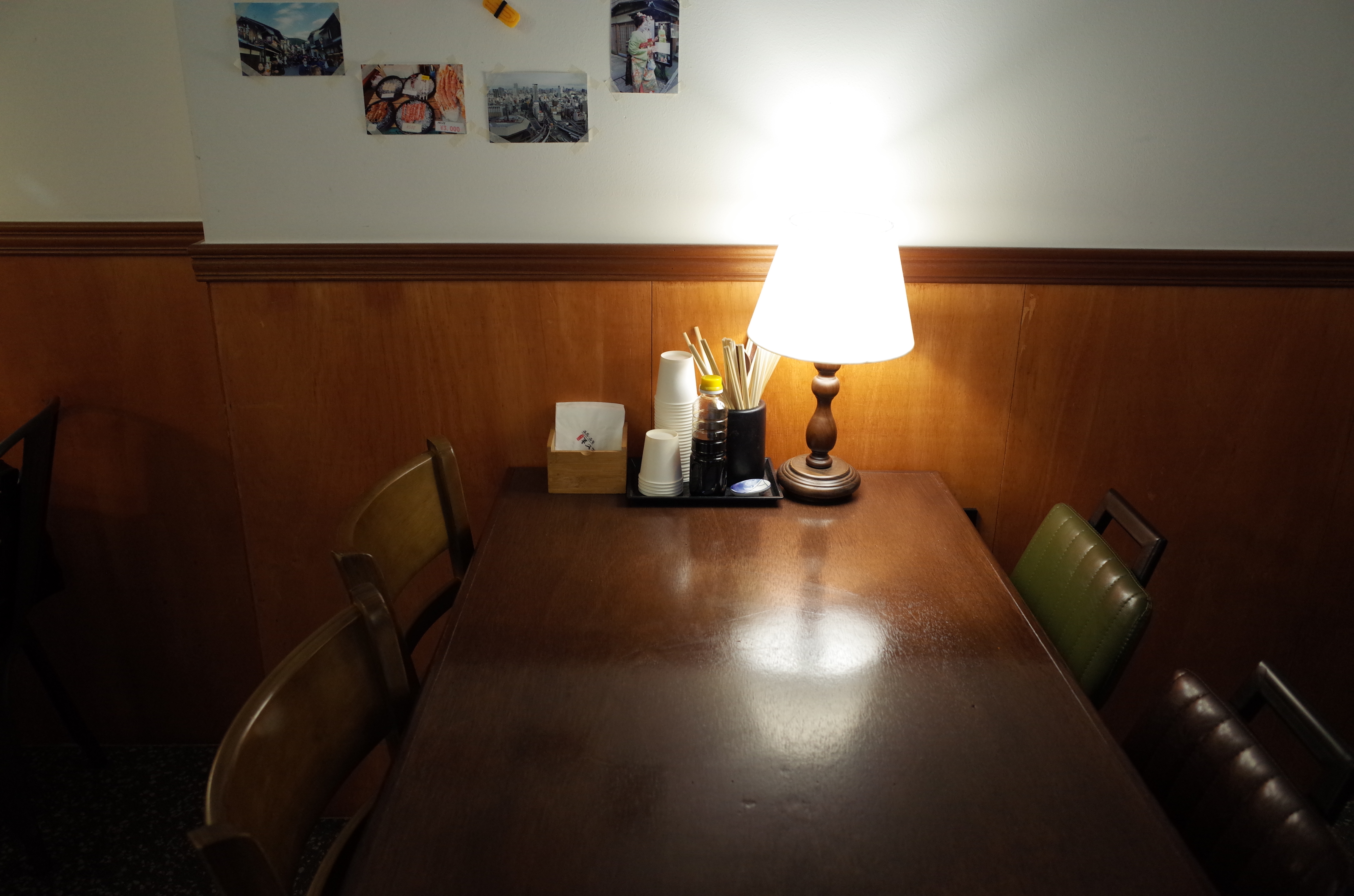 4인 테이블로 구성되어있고 좌측 벽은 붙박이 테이블로 만들어져 있어요. 붙박이 테이블치곤 넓은 편이라, 꼭 혼밥 하시는 분들 아니더라도 홀 테이블에 자리가 없을 때 바 테이블에 앉아도 불편함 없이 식사 가능할 것 같아요.
