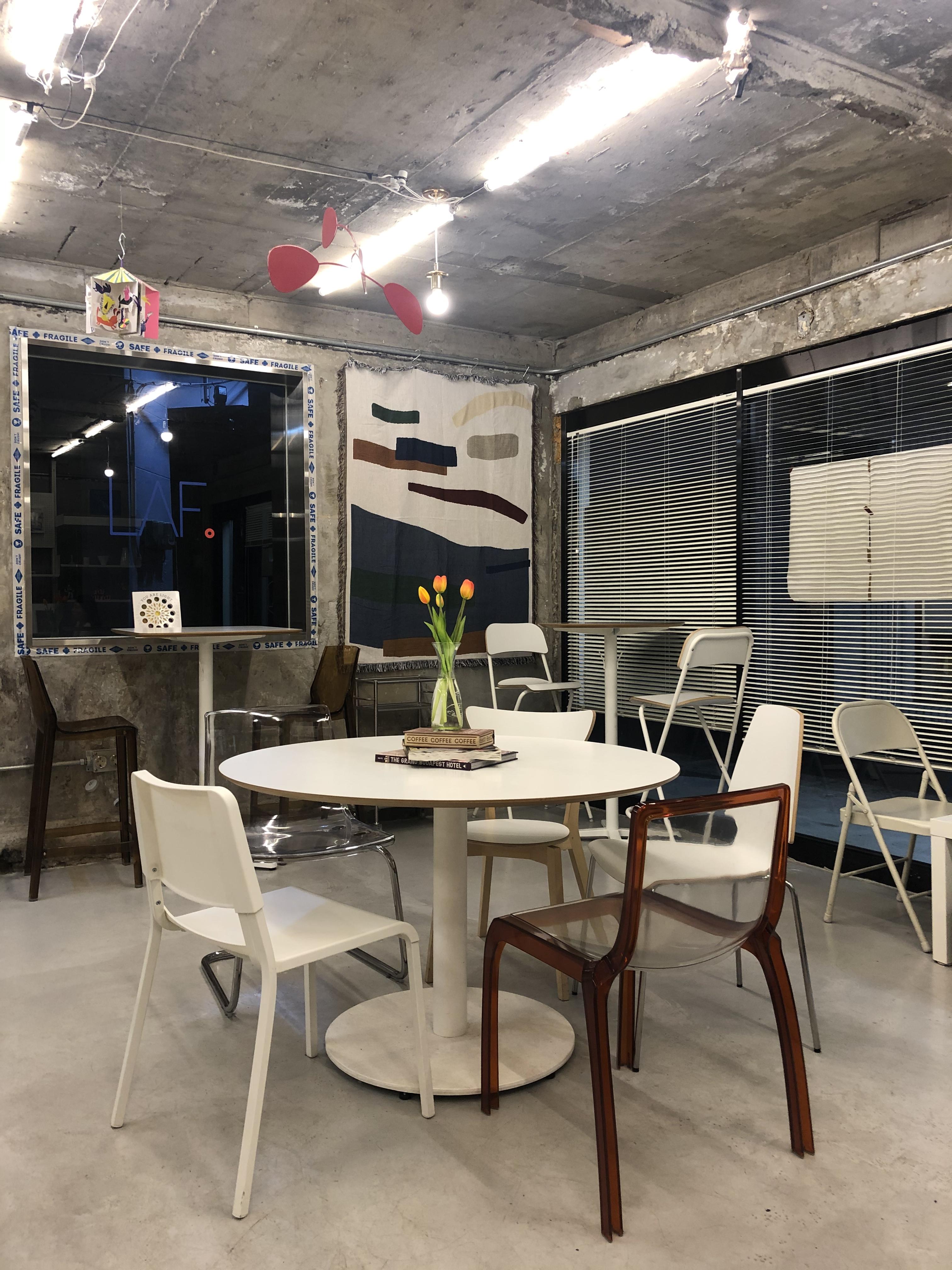 낮은 이케아 테이블로 된 자리는 가방과 소지품을 놓을 수 있도록 박스로 구비되어 있어요.