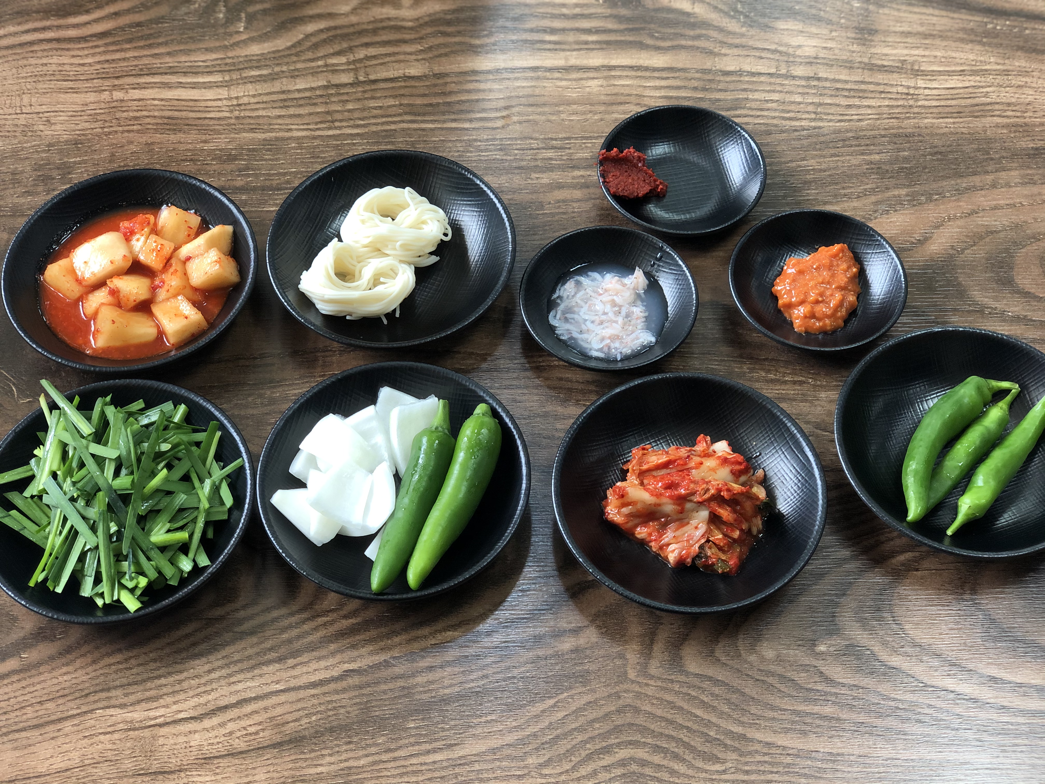 기본 반찬은 깍두기, 소면, 김치, 고추, 부추, 새우젓이 나옵니다.