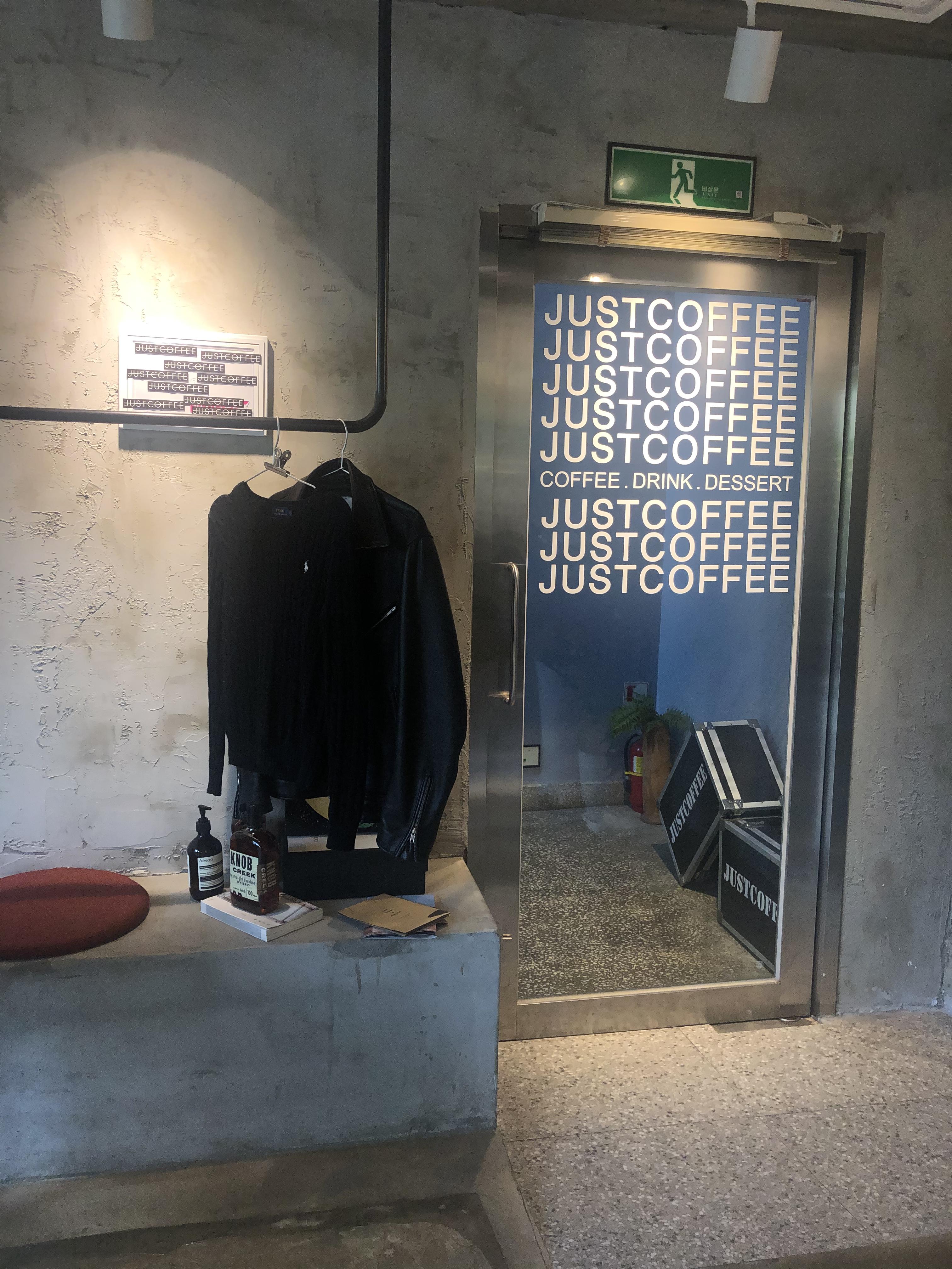 저스트 커피 메뉴는 와이셔츠에 적혀있어요.