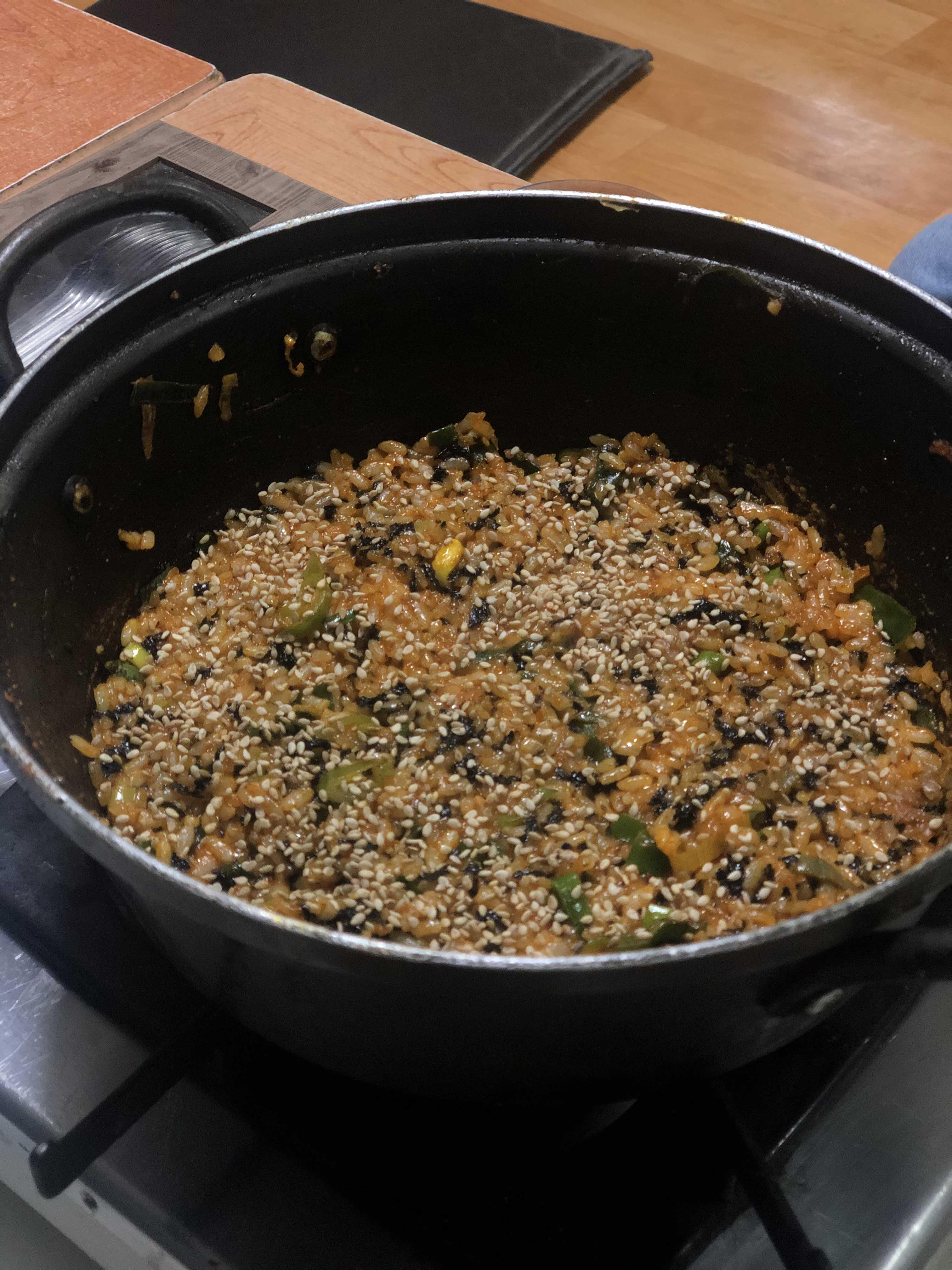 남은 국물에 밥과 참기름, 김을 넣고 볶은밥이에요.