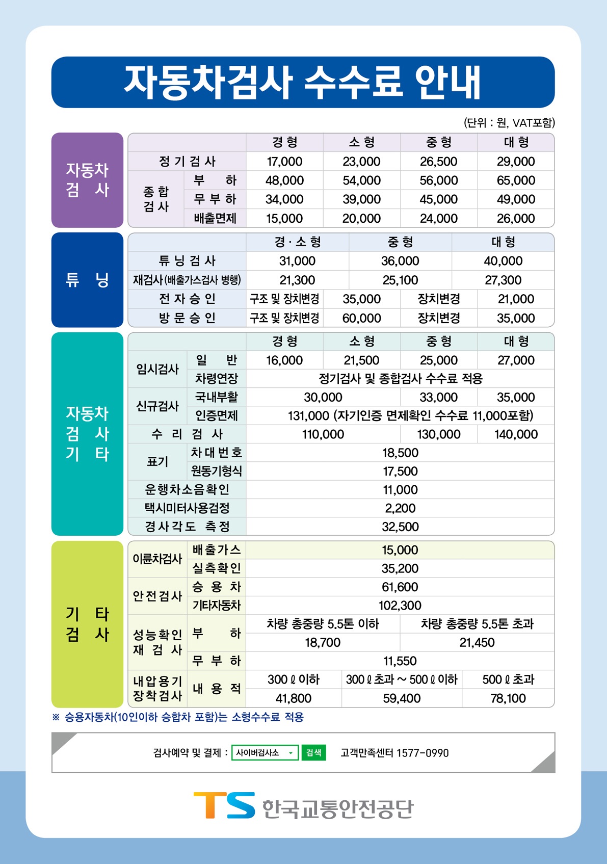 검사수수료는 검사 종류, 차종별로 다르며, 검사수수료 감면은 결제하기 단계에서 적용 가능합니다. 정보사용 및 SMS 수신동의 1. 개인정보의 수집·이용 목적 : 자동차검사 기간안내(문자&알림톡