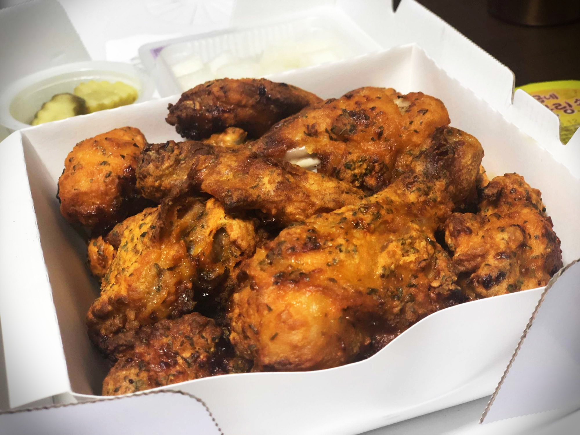 맵기는 맵다기보다는 고추 향? 튀김옷에 고추가 콕콕 박혀있어요. 그래서인지 치킨의 느끼함을 좀 잡아줘요.