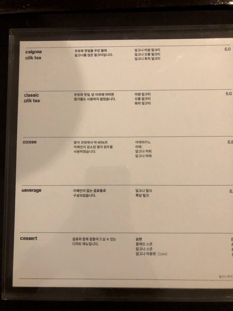 (메뉴판 사진이 잘렸는데 커피(4,500원), 플레인 스콘(4,000원) 제외 5,000원입니다.)