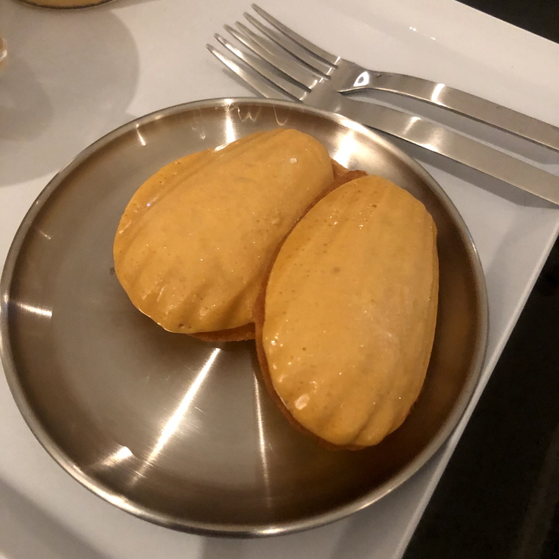 마들렌에 달고나가 올려져 있어요. 한쪽 면에만 달고나가 있어서 반대편으로 잘라야 그나마 먹기 편하겠더라고요.